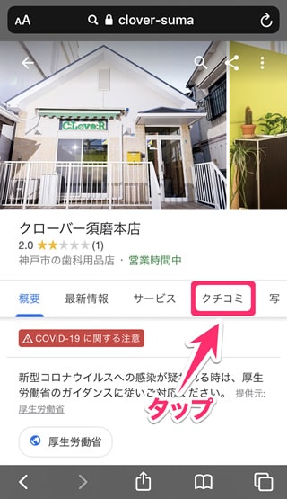 Googleマップの金パラ買取クローバー須磨本店情報ページにアクセス後、タブメニューより「クチコミ」を選択します。