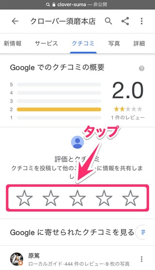 「Googleでのクチコミの概要」に移動しますので、「☆」を選択します。