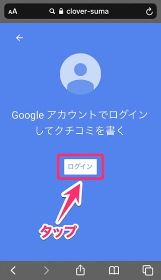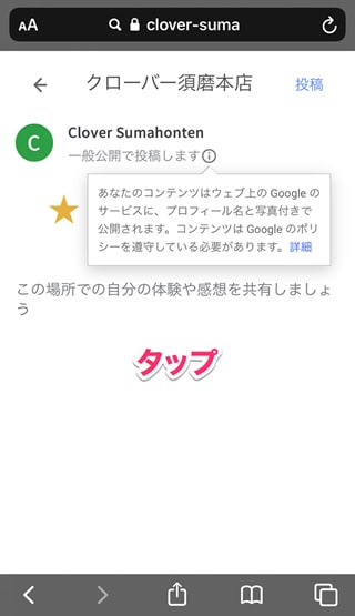ログインが完了すると、クチコミ投稿ページに移動します。Googleのポリシーに関する注意書きが表示されますので、ご確認後、画面(どこでも)を選択します。