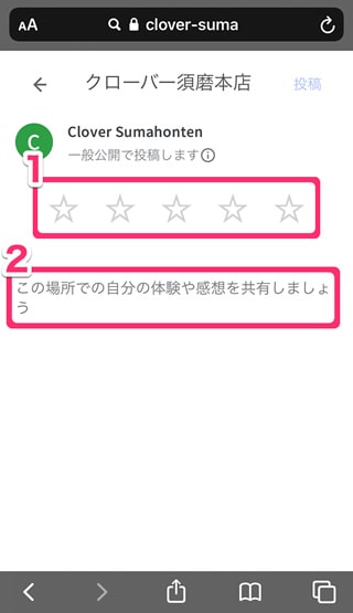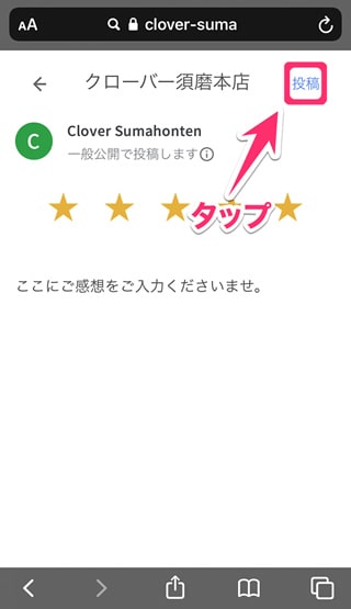 クチコミ投稿できる状態になりますので、「☆」の数の選択と、ご投稿内容をご入力くださいませ。